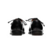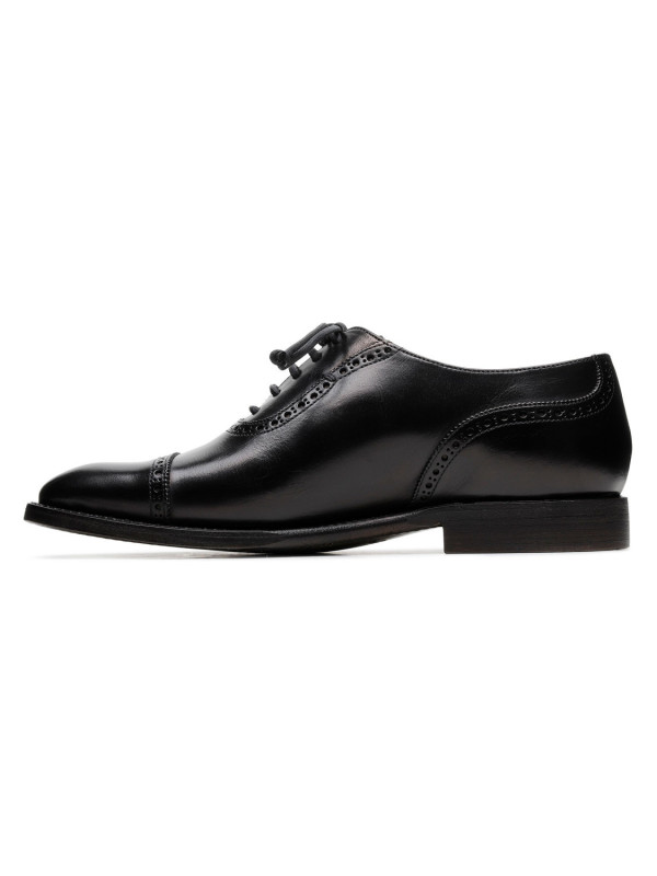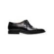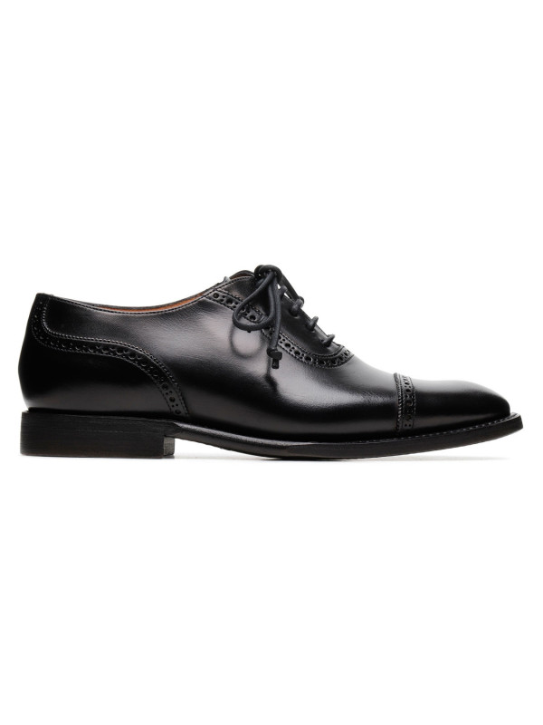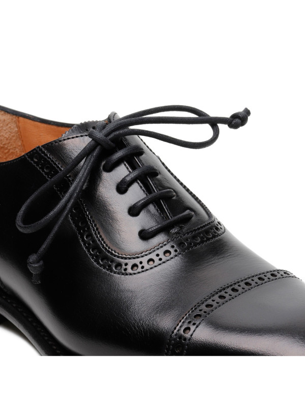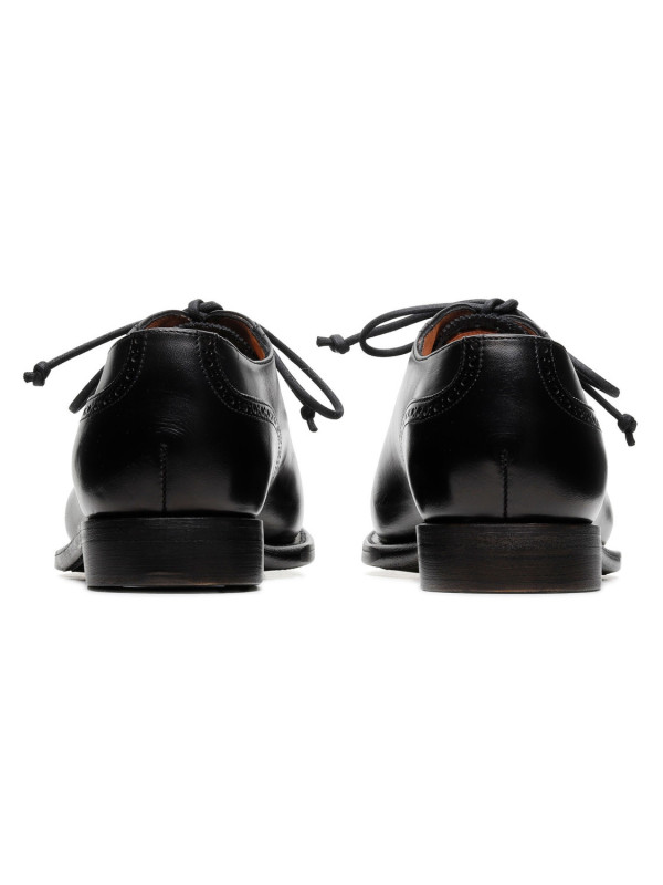 Black leather lace-up shoes with brogue details on upper, lace-up closure, squared toe, 1,5 stacked heel, fabric lining, leather and rubber sole. This item is crafted with natural plant or flower dye, beeswax stitchings, linen or canvas sewing twine, linen or canvas reinforcement, cotton laces, 100% natural rubber, natural lattex-base glue, leather heel counter.
