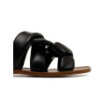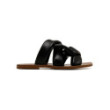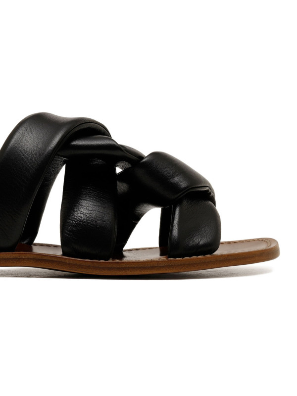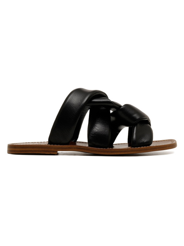 Black calf leather slide sandals featuring knotted strappy upper, open squared toe, slightly padded style, 0,5 stacked heel, stitchings at sight, slip on design, leather sole. Unlined.