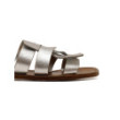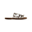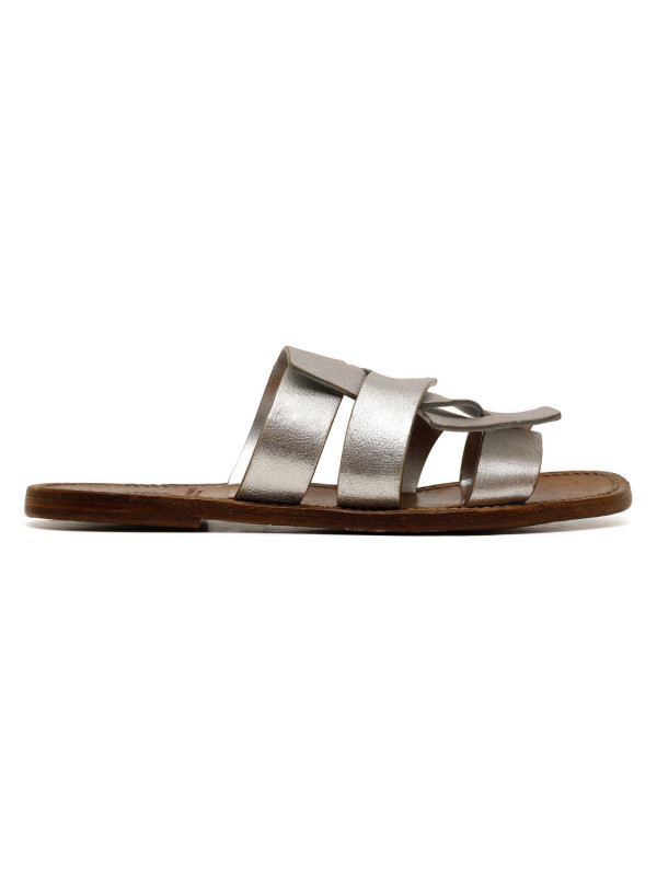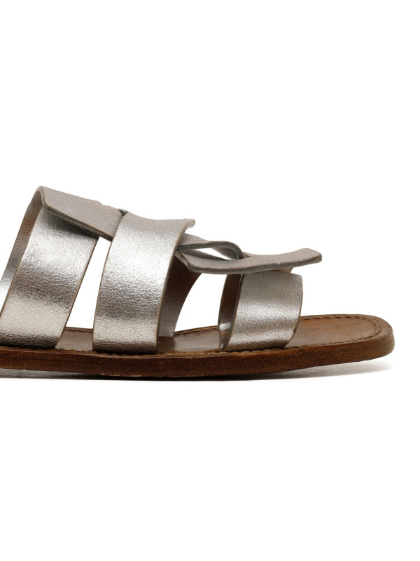 Metallic silver leather slide sandals with gladiator style, slip on design, open squared toe, 0,5 stacked heel, stitchings at sight, leather sole. Unlined.
