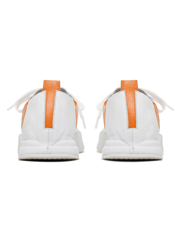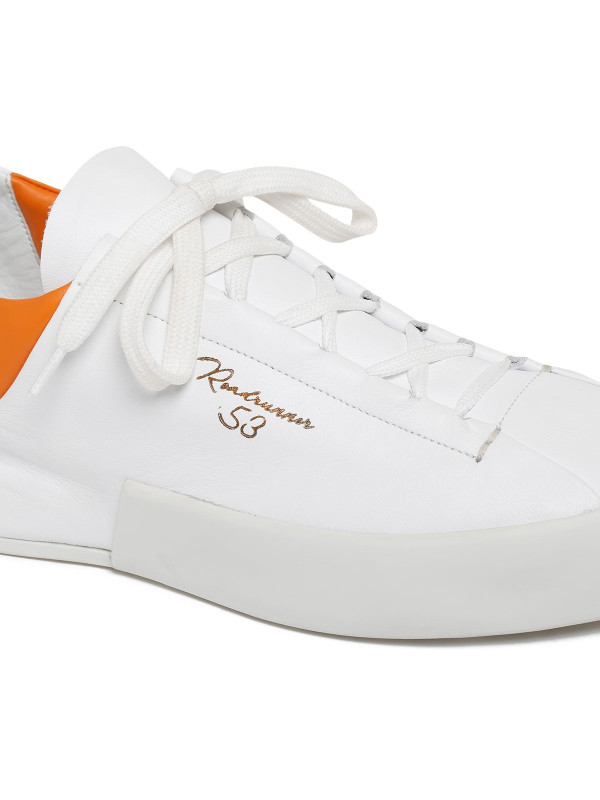 White Anilsoft Incerti sneakers from Roadrunner collection featuring low-top design, contrasting orange details, contrasting logo print on upper, round toe, white laces closure, orange leather heel tab, leather lining and white rubber sole.