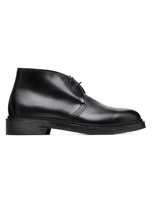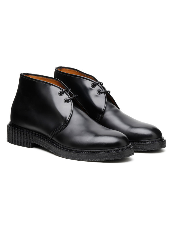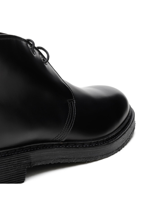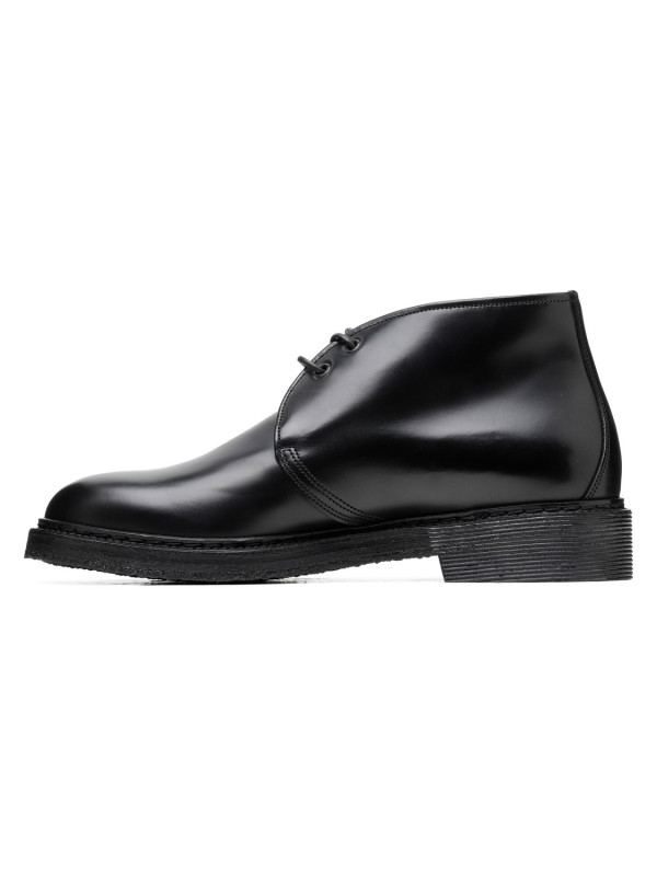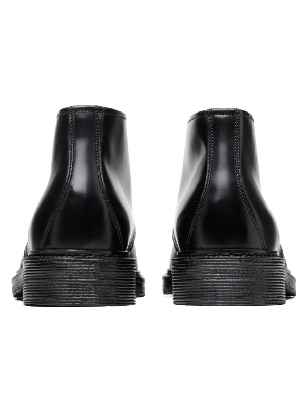 Stivaletti in pelle di vitello con effetto lucido, chiusura con lacci, punta rotonda, tacco 3,5, fodera in pelle di vitello e suola in gomma tono su tono.