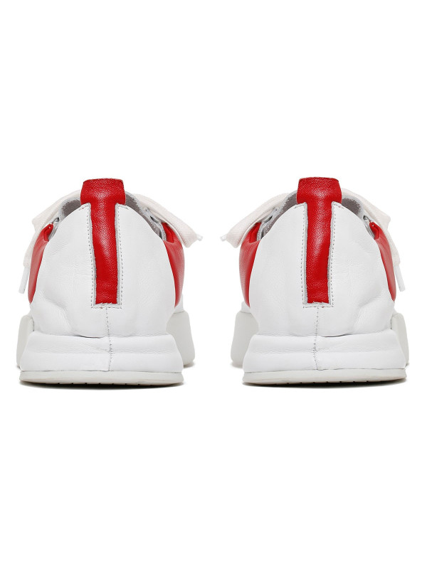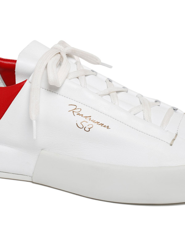 Sneakers Lavelli della collezione Roadrunner realizzate in Analsoft di colore bianco, caratterizzate da dettagli di colore rosso, logo a contrasto stampato sulla tomaia, punta rotonda, chiusura con lacci di colore bianco, talloncino in pelle rosso, fodera in pelle e suola in gomma di colore bianco.