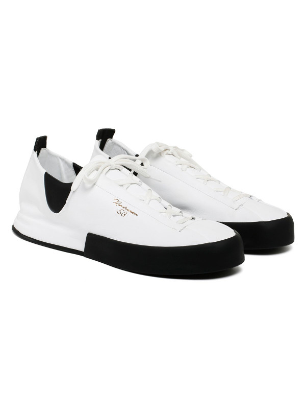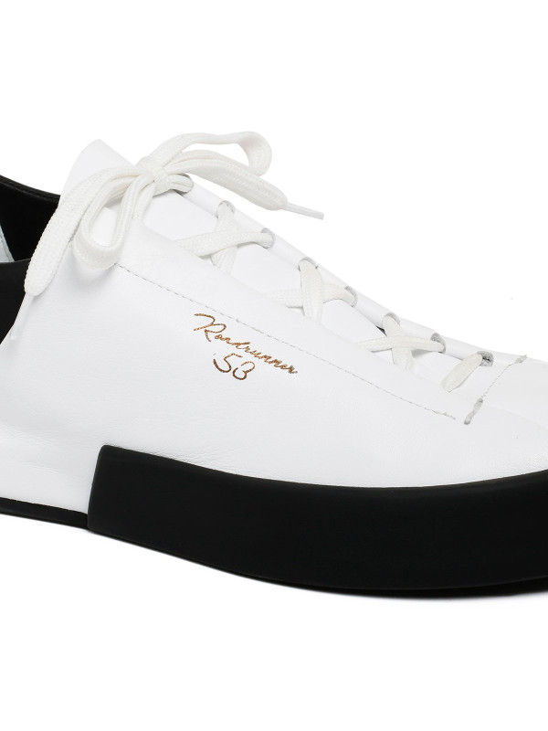 Sneakers Acquarone della collezione Roadrunner realizzate in Analsoft di colore bianco, caratterizzate da dettagli neri a contrasto, logo in metallo dorato stampato sulla tomaia, punta rotonda, chiusura con lacci bianchi, talloncino in pelle nera, fodera in pelle e suola in gomma.